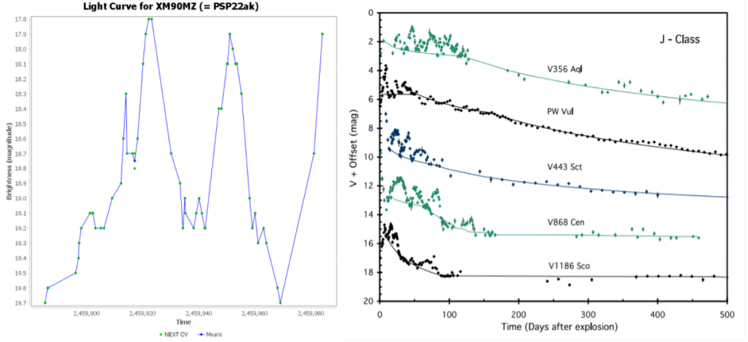 根据NEXT的观测,在ATel#15831发布之后,该候选体在2023年1月上旬再次增亮,1月6日达到第二次峰值,亮度17.9星等(无滤镜),随后再次变暗,1月24日已暗至19.7星等(无滤镜),此后几天它在NEXT的图像上不可见。大家由此猜测它可能是一颗J型新星[依据新星光变曲线形状将新星分为七大类型,其中一类在达到峰值亮度以后,变暗3等之前,会多次增亮,称为J型新星,J代表Jitters(抖动)]。