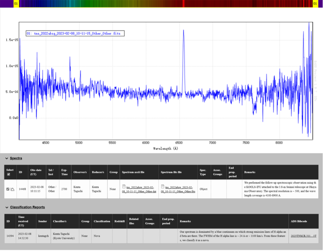 那么这次,是否有可能得到它的光谱呢?答案是肯定的。2月8日晚,日本京都大学博士生田口健太拍摄了该候选体的光谱,并于晚些时候将光谱上传至TNS,证认其为一颗新星。