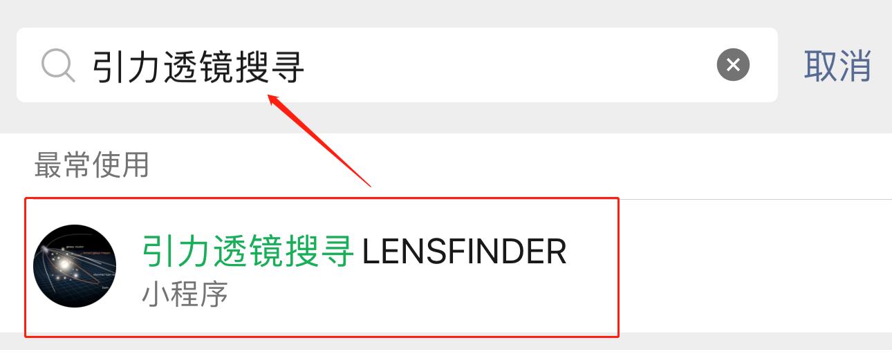 您可扫描小程序二维码或直接在微信搜索框搜索“引力透镜搜寻LENSFINDER”。