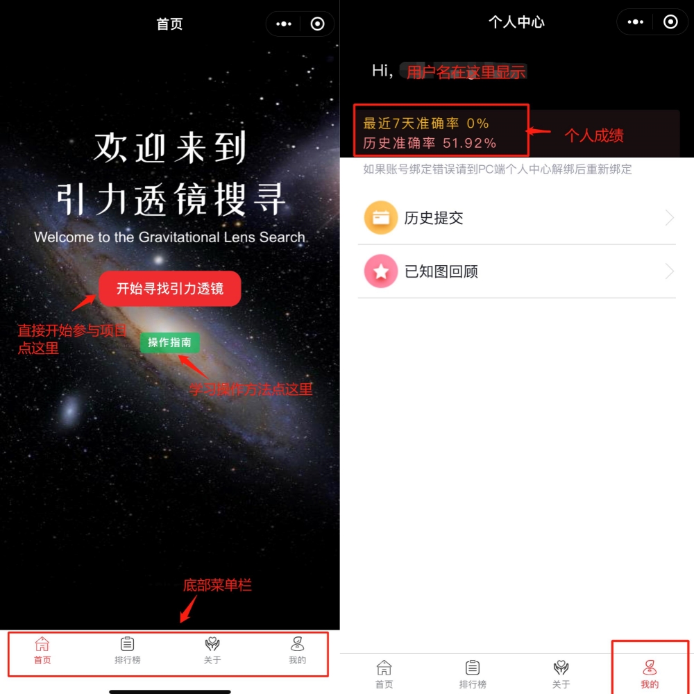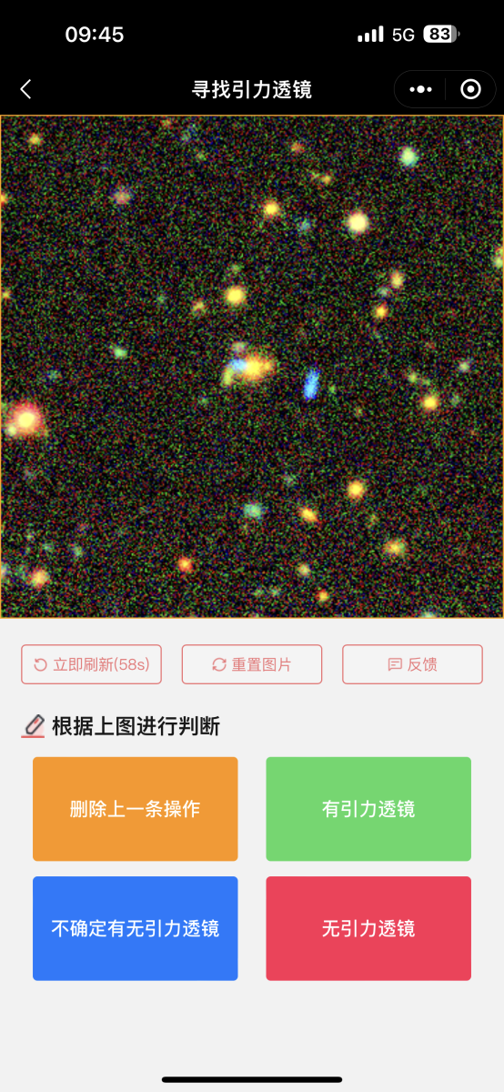 小程序在操作上更加贴合移动端的特点,提供了更简洁、直观的用户界面。通过优化的设计和布局,用户能够更快速地了解引力透镜背景知识、开展搜寻任务。这种移动端友好的体验让用户能够更流畅地参与到公众科学项目中,真正实现科学在指尖的触达。
