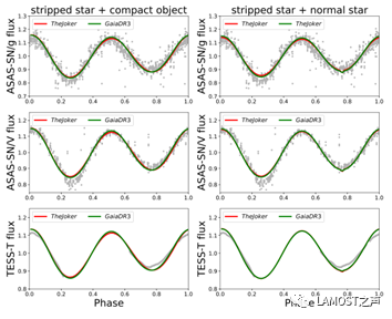 图2. G8441的光变曲线以及最佳拟合的结果图。左图为巨星与致密星系统的模型拟合,右图为巨星与普通恒星的模型拟合。