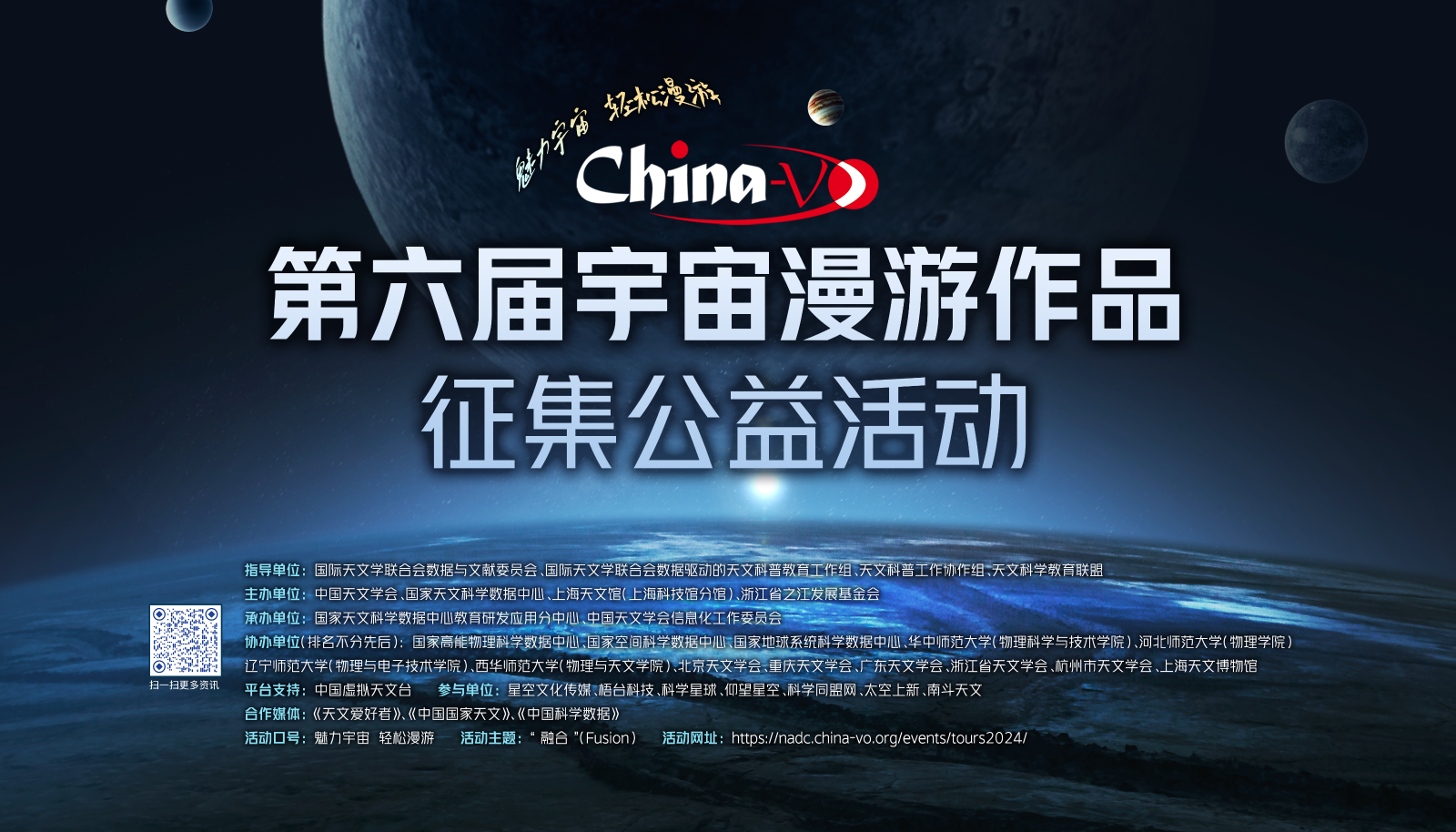 由国家天文科学数据中心主办的第六届宇宙漫游作品征集公益活动作品提交截止日期临近,很多小伙伴都在为自己的作品做最后的润色和完善。为了给参与者们更充分的时间展示才华,经活动组委会研究决定,计划将作品征集截止日期延期至2024年6月6日24时。希望大家可以充分利用这段延长的宝贵时间,继续打磨作品,为本届征集活动呈现更多精彩。