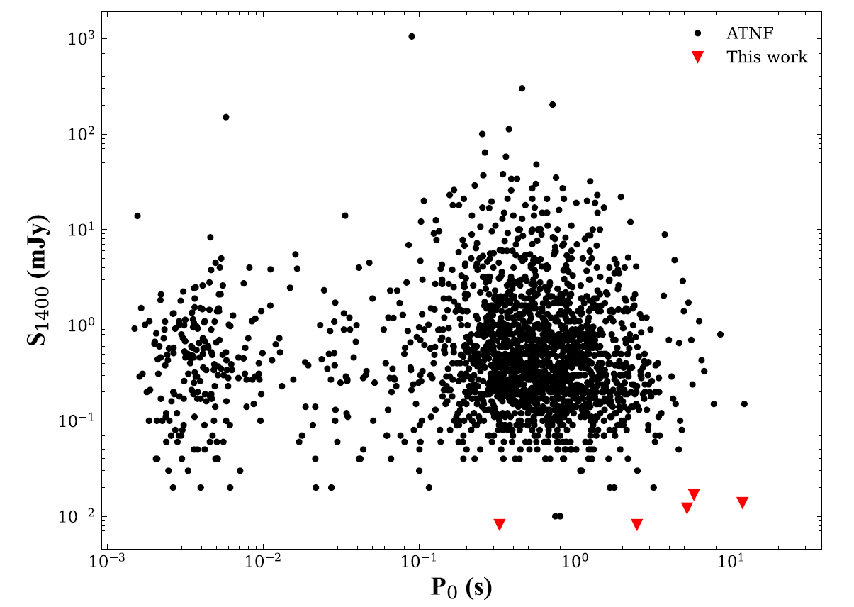 研究团队利用FAST的超高灵敏度,对四颗磁星(SGR 0501+4516、Swift J1834.9–0846、1E 1841–045、SGR 1900+14)和一颗类磁星脉冲星(PSR J1846–0258)进行观测后,结果显示这些天体在1250 MHz频率下均未探测到周期性射电脉冲或单脉冲信号。研究团队进一步计算了这些天体的射电辐射流量上限(最低仅8.2),显著低于普通脉冲星。这一发现表明,这些磁星和类磁星脉冲星可能是真正的“射电静默”天体,或者它们的射电辐射方向并未指向地球。这一结果不仅加深了我们对磁星射电辐射机制的理解,也为未来的磁星观测提供了重要的参考。