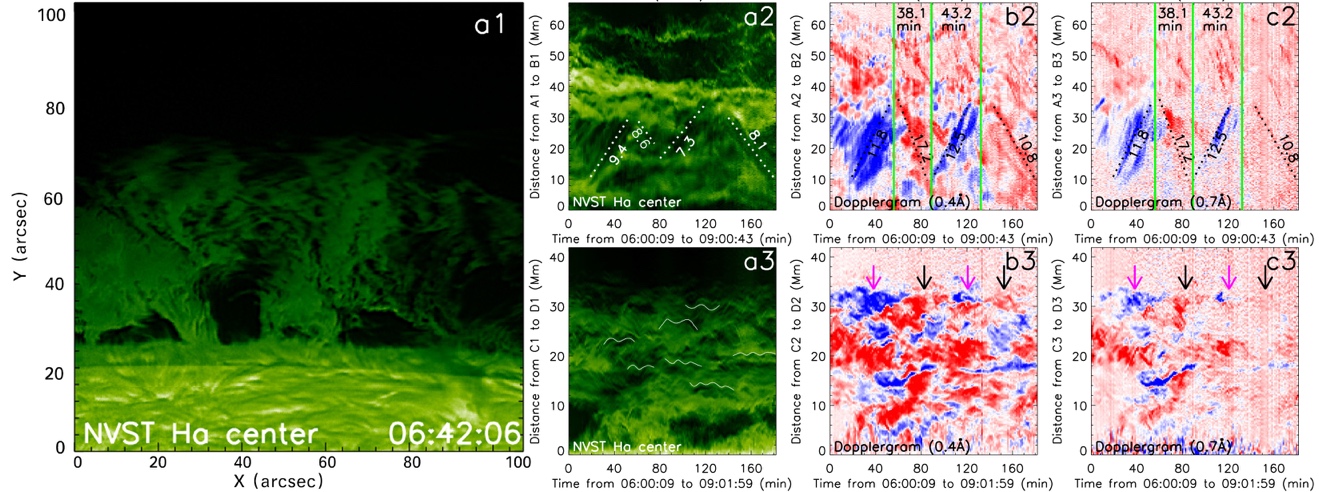 图(a1):NVST观测的边缘日珥。图(a2-c2):日珥中间部分的纵向震荡。图(a3-c3):日珥主体的横向震荡。