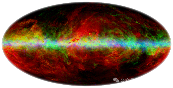 图1:基于近、中、远距离尘埃消光大小作为三原色构建的三维消光图全景图。图中采用红、绿、蓝通道分别表征不同距离范围内的尘埃分布:红色代表近距离尘埃(0–0.6 kpc),绿色代表中距离尘埃(0.6–2 kpc),蓝色代表远距离尘埃(2 kpc 至最大可靠距离)。颜色反映了不同距离区间内消光大小(以对数尺度)。