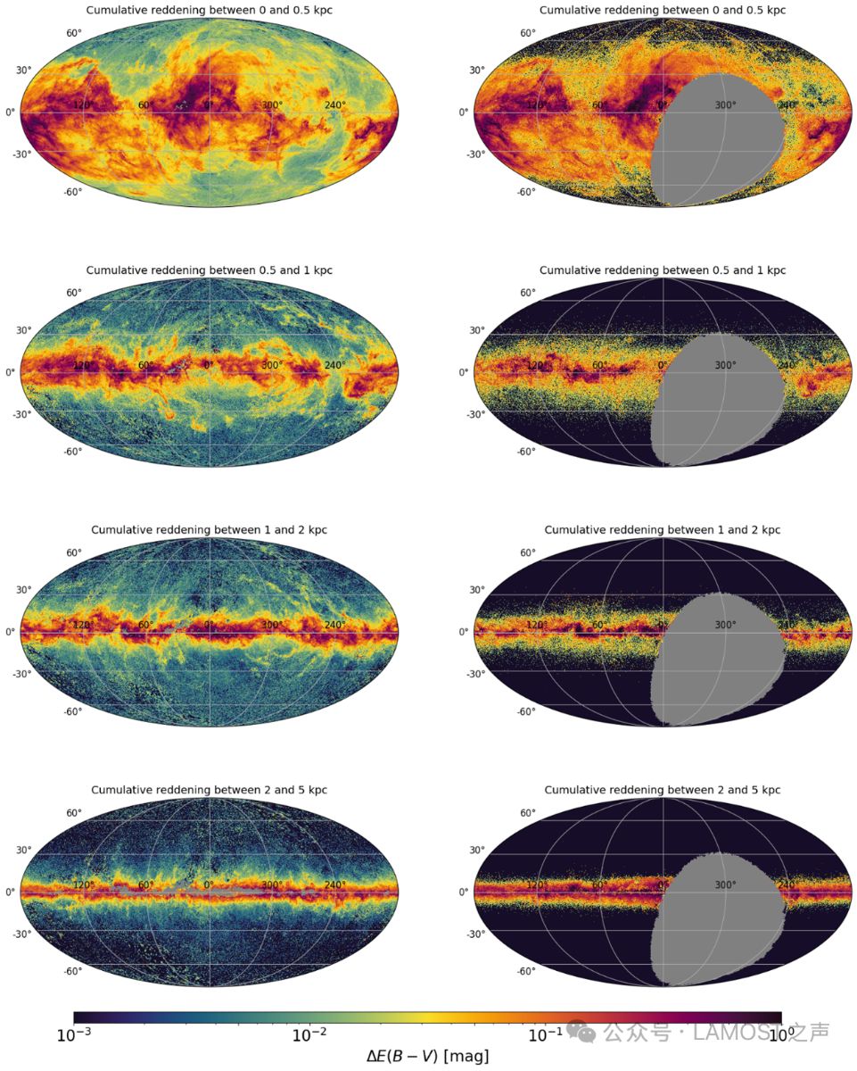 图2:在不同距离范围内的累积红化分布:0–0.5kpc、0.5–1kpc、1–2kpc 和 2–5 kpc。图的左侧显示了本研究的结果,右侧展示了Green et al 2019的结果。所有子图均以角分辨率为 3.3角分绘制。在近距离和大尺度上,两组数据集显示出良好的一致性,得益于本工作三维尘埃消光图的高精度、高分辨率与探测深度,许多以往未被识别的微弱结构得以显现。