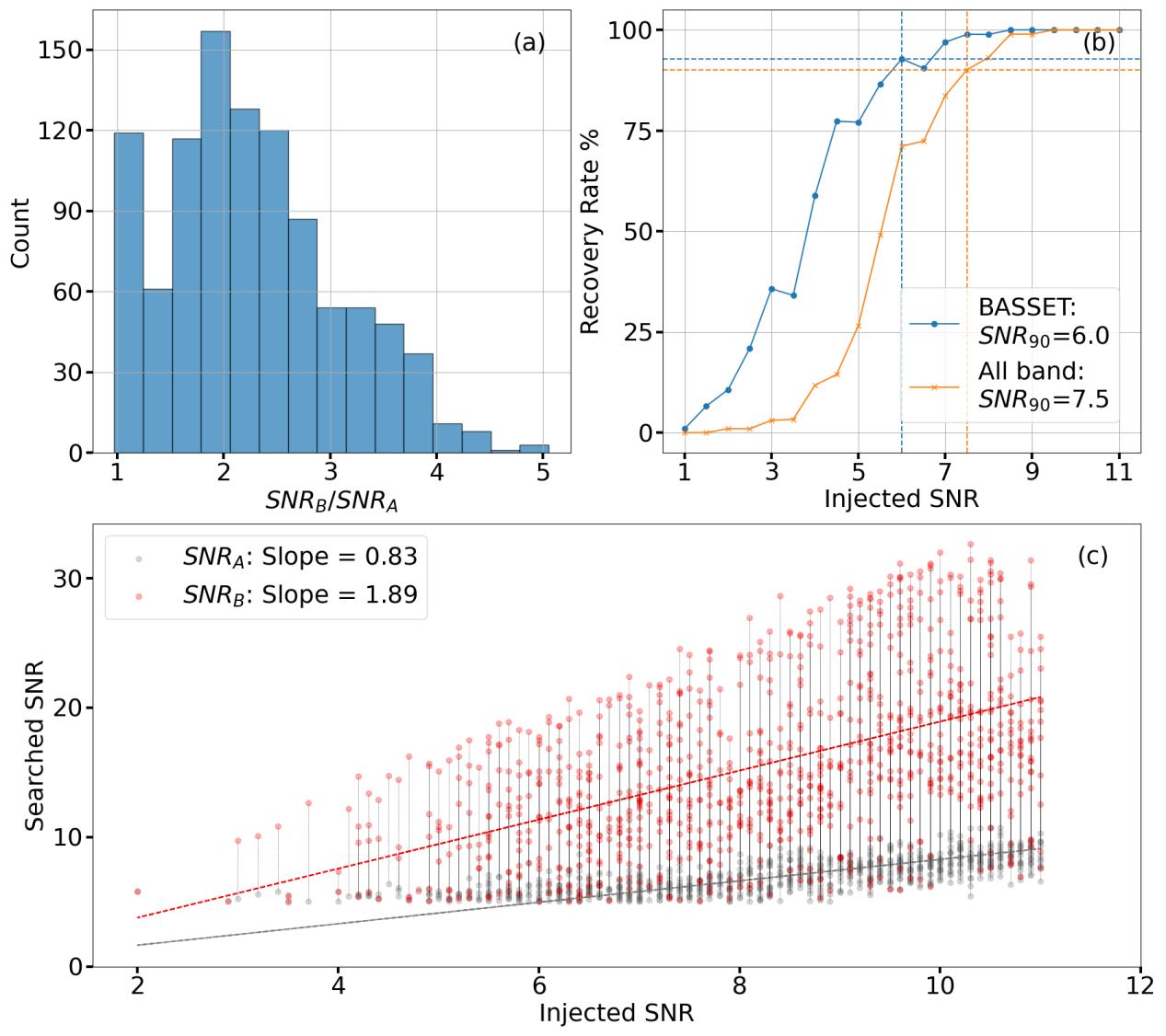 研究人员结合脉冲注入模拟,量化了BASSET探测完备性,进一步利用BASSET重新处理了FAST于2020年对FRB 20190520B的观测数据,在完整复现已发表75个脉冲的基础上新探测到79个暗弱窄带脉冲,其中超过约60%信噪比低于传统方法的探测阈值,显著扩展了该源爆发样本量,并改善了重复暴能量分布函数在低能端的完备性。这一工作有望进一步为国际各望远镜开展射电暂现源巡天提供有力支撑。