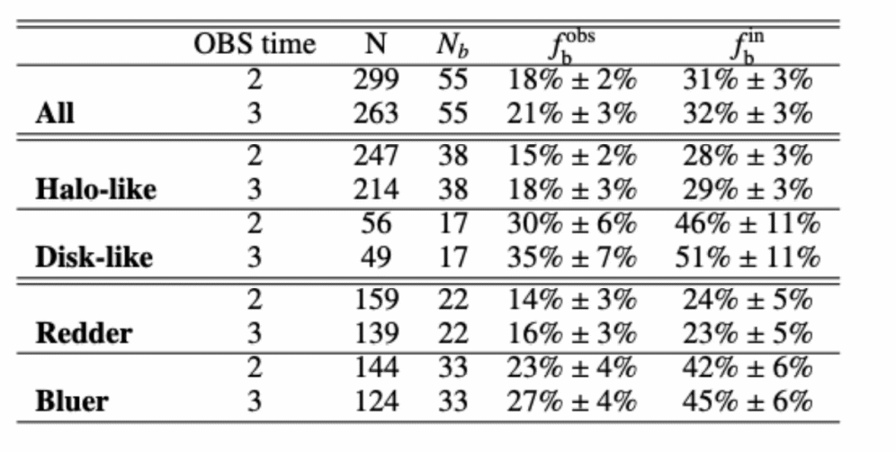 表一:不同分组下BHB的观测和内禀双星比例。
