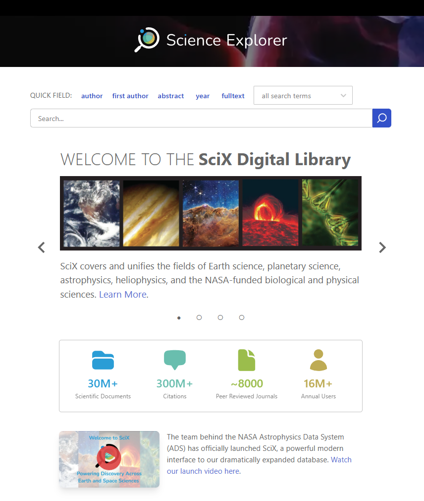 近日,NASA正式发布了新一代科学文献平台——SciX(Science Explorer¹),目前由史密松天体物理台(Smithsonian Astrophysical Observatory,SAO)代为运营。作为NASA推进科研数据整合与开放科学战略的关键一步,SciX不仅延续了享誉学界的ADS(Astrophysics Data System)在文献检索与数据关联上的优势,更将这一成熟模式拓展至更多学科领域,旨在打造出NASA体系内首个真正意义上的跨学科知识与数据探索门户。