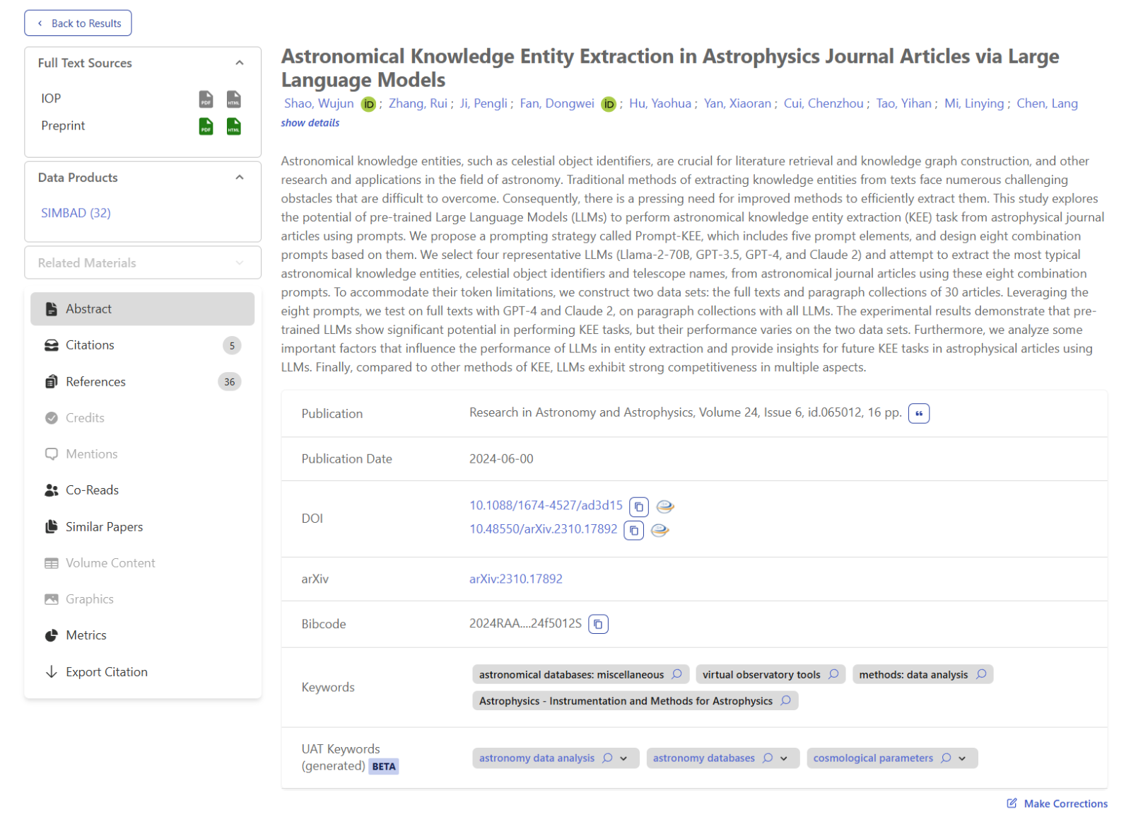 SciX不仅提供文献及其元数据(作者、单位、DOI、Bibcode、引用信息等),还通过链接将论文与相关的出版社、ORCID、相似文献、参考文献乃至特定天体对象(如行星、恒星)相互关联³,实现“从文献到数据,从数据到发现”的无缝跳转。这使得科研成果的可追溯性与复用性显著提升。