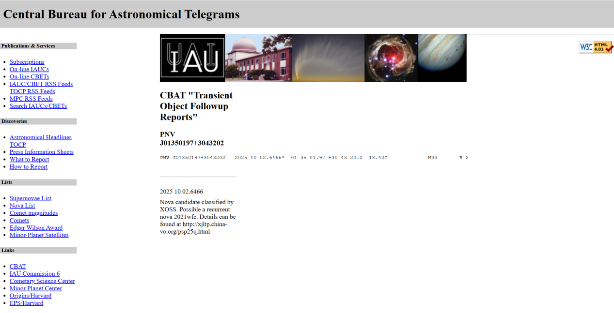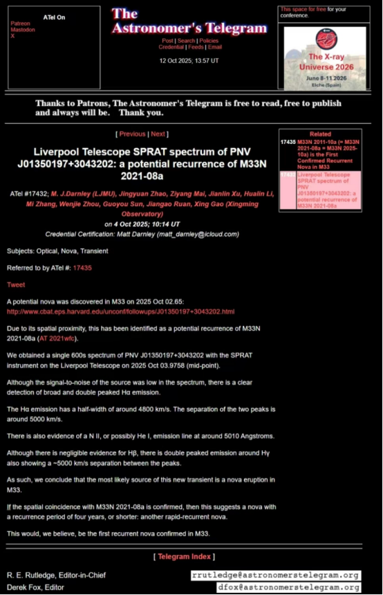 暂现源PNV J01350197+3043202近期由星明天文台公众超新星搜寻项目(PSP)团队在M33外围发现,它靠近M33N 2021-08a(AT2021wfc)的位置。随后,ATel #17432号电文报道了PNV J01350197+3043202的光谱,该光谱与新星爆发的特征相符。在下文中,我们将其称为M33N 2025-10a。