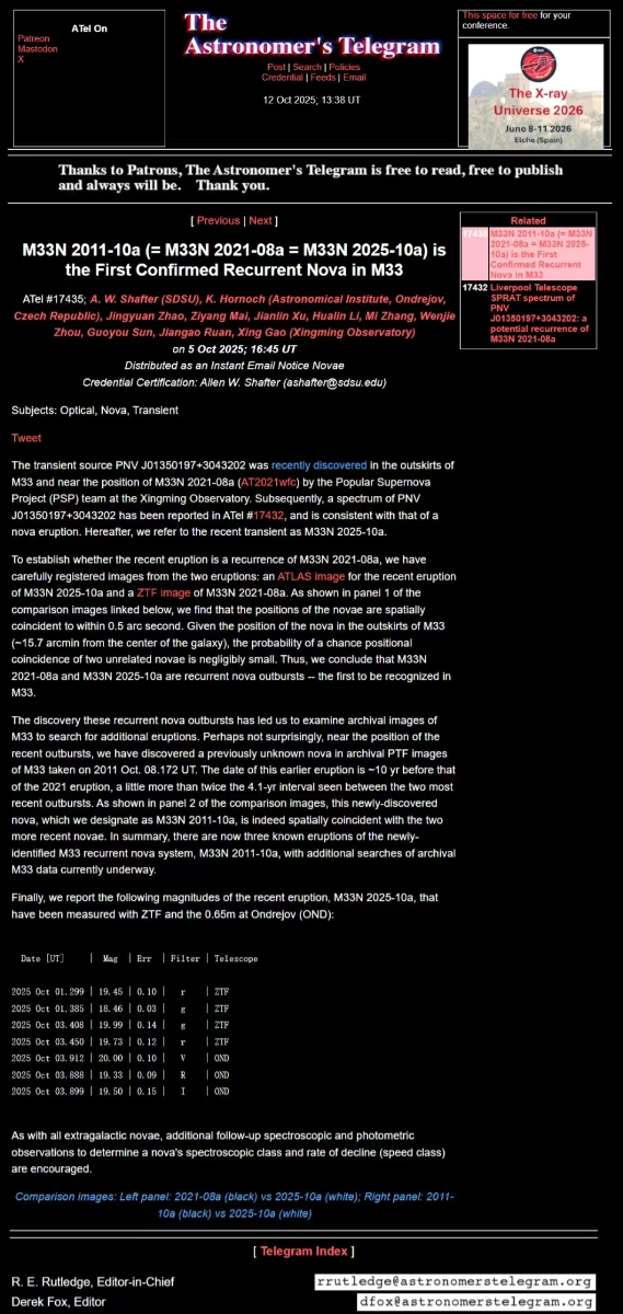 10月6日凌晨,Shafter教授发布了ATel#17435,精确比较了2011年(编号为M33N 2011-10a)、2021年(编号为M33N 2021-08a)、2025年(编号为M33N 2025-10a)三次爆发的位置,指出三者位置重合,证认这三次爆发起源于相同的新星系统,因此这是在M33中发现的首个再发新星系统。2011年和2025年爆发的所有发现者都被列为共同作者。