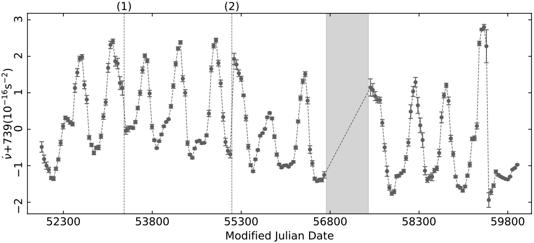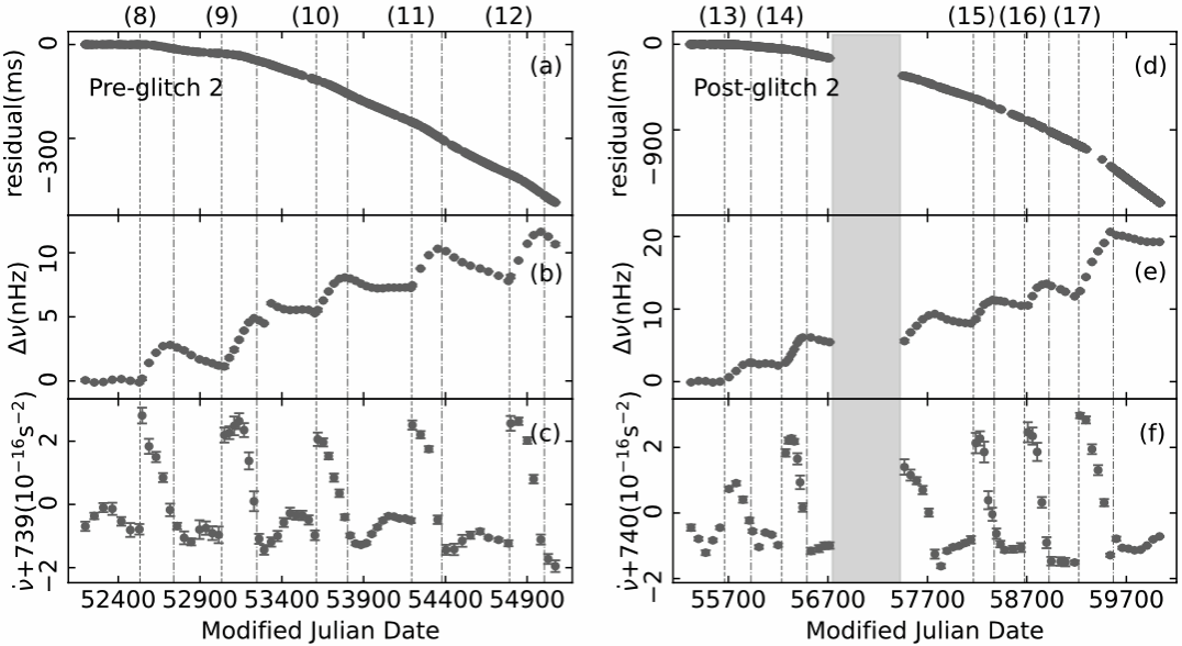 图1:PSR J0922+0638在大跃变(glitch 2)前后的计时残差和自转演化。灰色区域为南山望远镜的数据缺失。垂直虚线为慢跃变的开始时间,而垂直点划线表示其结束时间。顶部括号中的数字对应于慢跃变的序号。