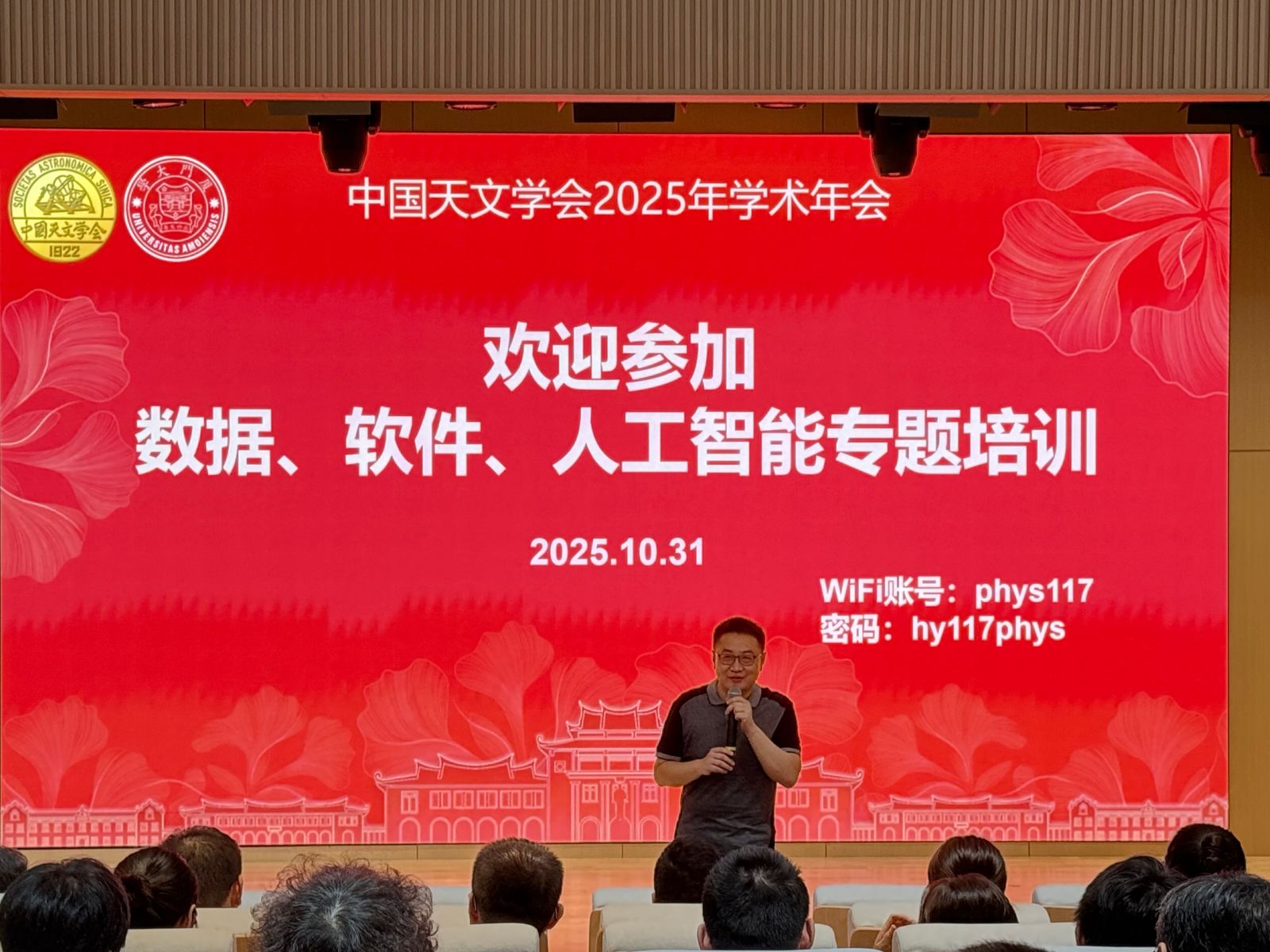 2025年10月31日,中国天文学会2025年学术年会“数据、软件、人工智能专题培训”在厦门大学思明校区海韵园成功举办。本次培训由中国天文学会信息化工作委员会、国家天文科学数据中心、厦门大学物理科学与技术学院联合组织,旨在系统提升科研人员运用先进数据技术、软件工具与人工智能方法的能力,从而赋能科学研究,加速科学发现。培训吸引了来自全国各高校、科研机构的百余名青年学者与研究生共同参与。