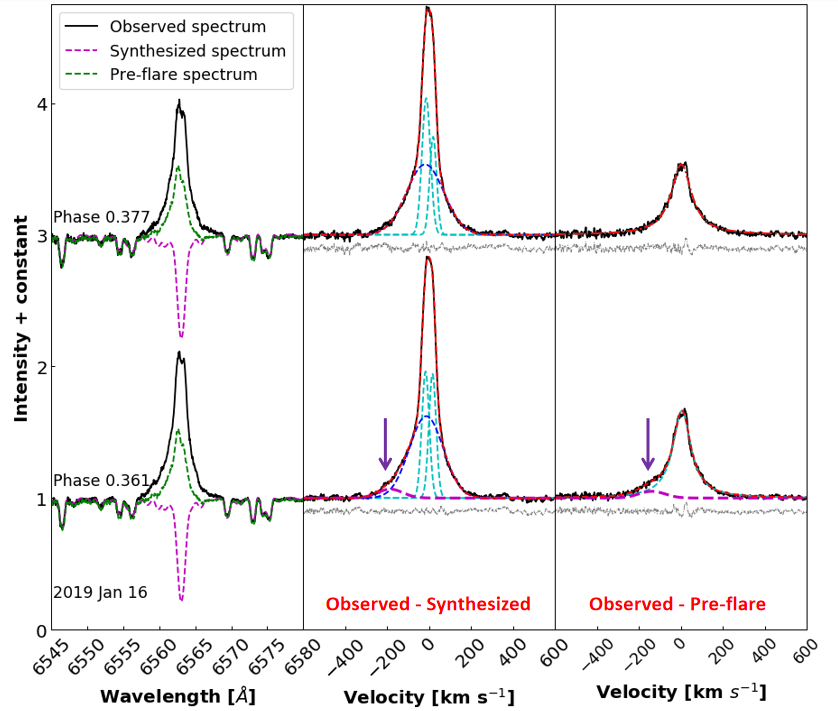 图1. 在恒星II Peg上探测到的CME候选。上方子图展示了耀斑爆发期间的Hα谱线轮廓特征以及通过不同分析方法识别出的高速运动成分(箭头所示)。下方子图对比了II Peg的CME候选与太阳CME以及其他恒星的CME候选在质量和动能上的差异。