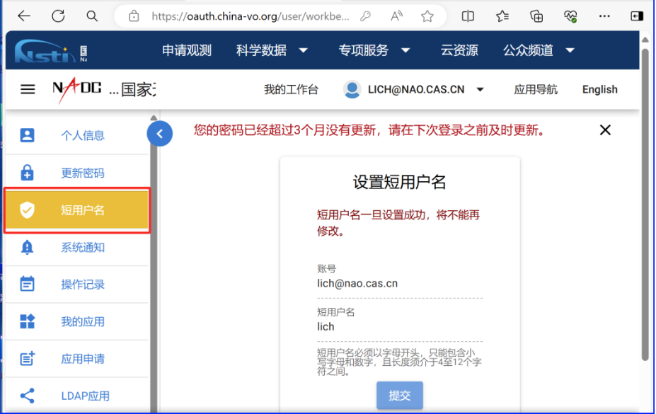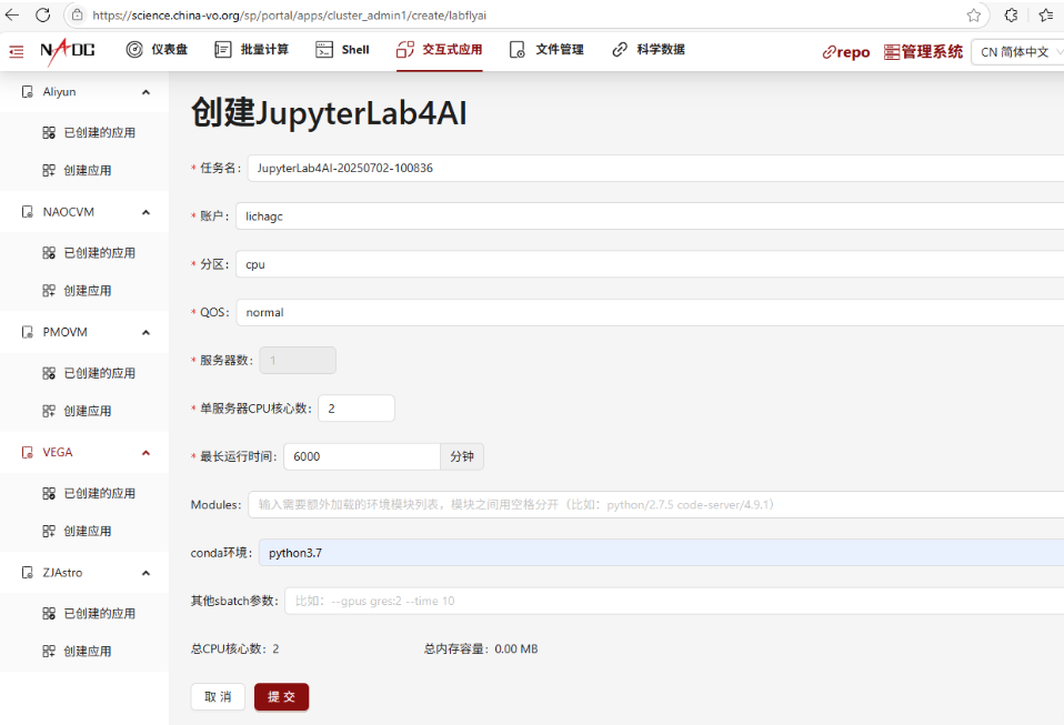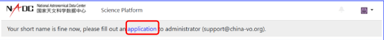 1、账号申请:科学平台使用与国家天文科学数据中心用户通行证相同的账号,但使用前需设置账号的短用户名及密码,并提交资源申请。