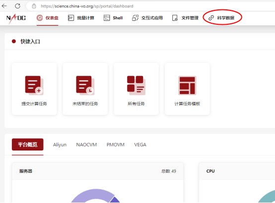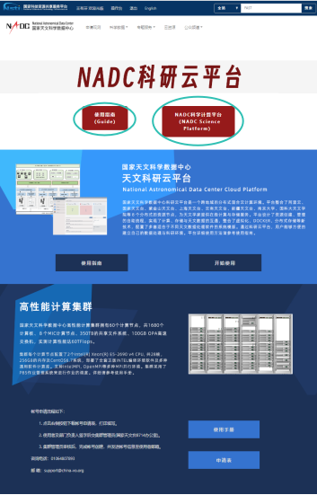 1)访问国家天文科学数据中心官网 https://nadc.china-vo.org/,在页面右上角找到“云资源”,点击进入科研云平台页面(图5)。点击蓝绿色大椭圆区域内的“NADC科学计算平台”登录,详细使用方法可参考小椭圆区域所示的“使用指南”。