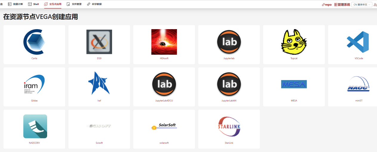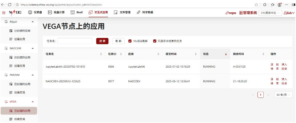 为方便用户使用云平台,元数据页面提供了直接跳转至科学云平台的链接。用户登录云平台后,点击图1元数据页面中的“前往NADC科研云平台使用”,将直接进入图7所示的交互应用界面,从而省去挂载数据和创建应用的步骤。