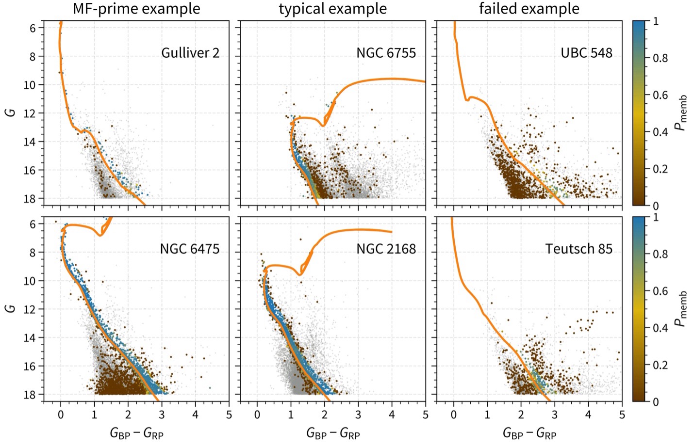 在传统的星团研究中,天文学家往往面临着一个棘手的“成员星筛选”难题。为了获得干净的星团样本,以往的方法通常需要设定严格的条件来剔除背景场星,但这种“硬切”的做法往往是一把双刃剑:在去除噪声的同时,也极易误删真实的成员星,导致数据完整性受损,进而使得拟合出的星团年龄和质量分布出现偏差。针对这一痛点,研究团队开发的 MiMO 模型采用了一种全新的贝叶斯统计思路。它不再依赖严格的预筛选,而是将星团天区恒星在颜色星等图(CMD)上的分布视为单星、双星和场星的混合,同时将各成分纳入统一框架,解决了传统CMD拟合方法中场星污染和成员选择不完备的难题 。这种方法能够最大限度地利用观测数据,不仅提升了参数测定的精度和稳健性,还能够自洽地导出恒星质量函数等关键信息。
