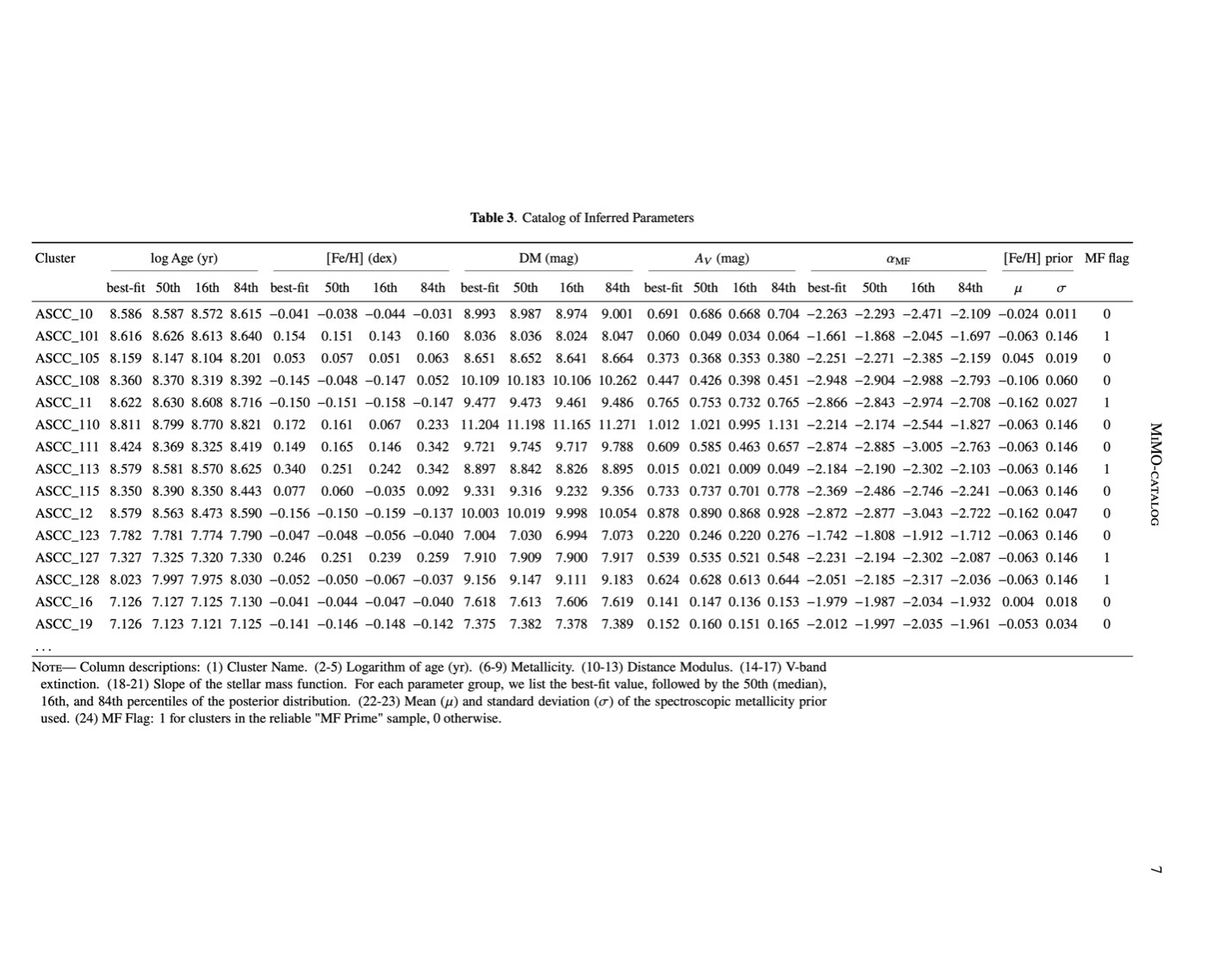 图3. 该表展示了MIMO星表的部分数据样例,涵盖了1232个疏散星团的物理参数 。包括年龄、金属丰度、距离模数和消光,以及其恒星质量函数斜率。