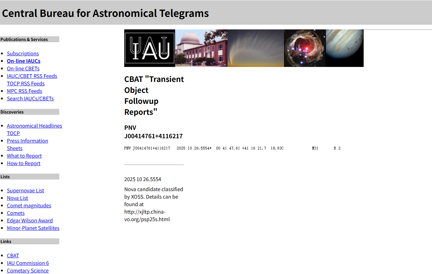 目前,PSP已发现213颗候选体,其中40颗超新星、33颗河外新星、1个活动星系核获得光谱证认,另有109颗各类变星被国际变星索引数据库(VSX)收录。