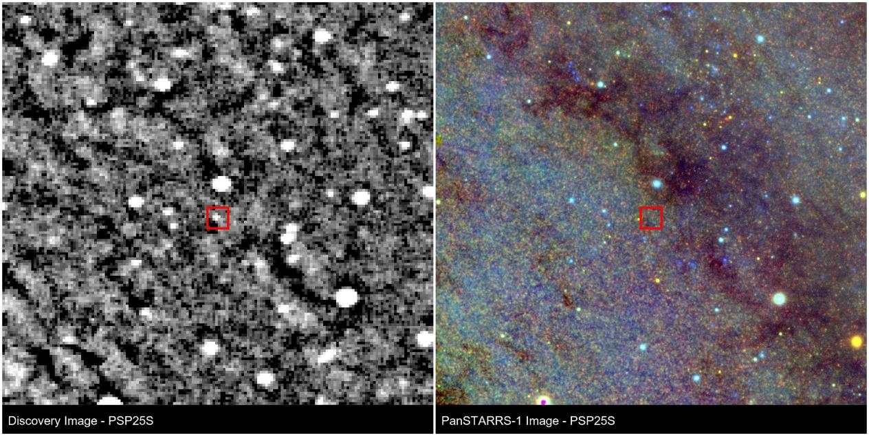 图1 发现图像(左)中心方框内可见星点,PanSTARRS历史图像对应位置没有星点。综合考虑位置和亮度,初步判断为河外新星候选体