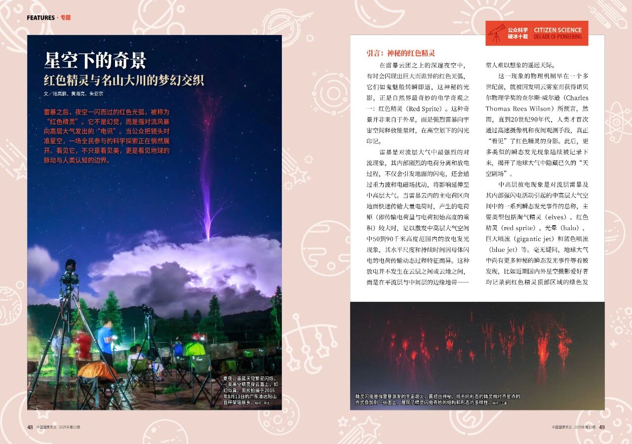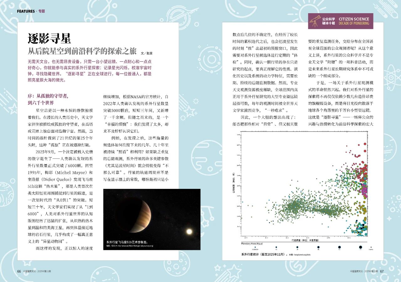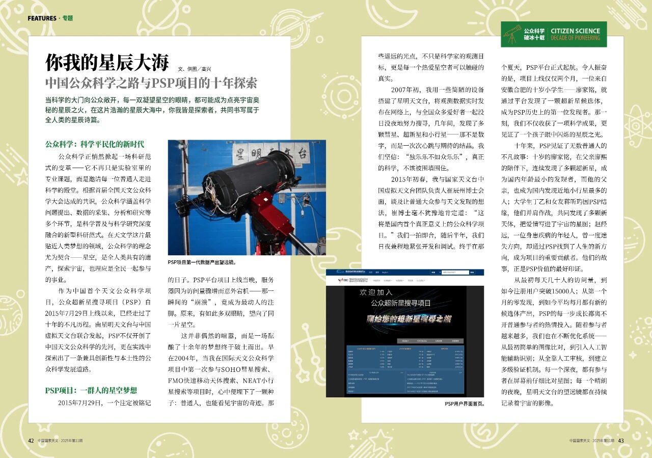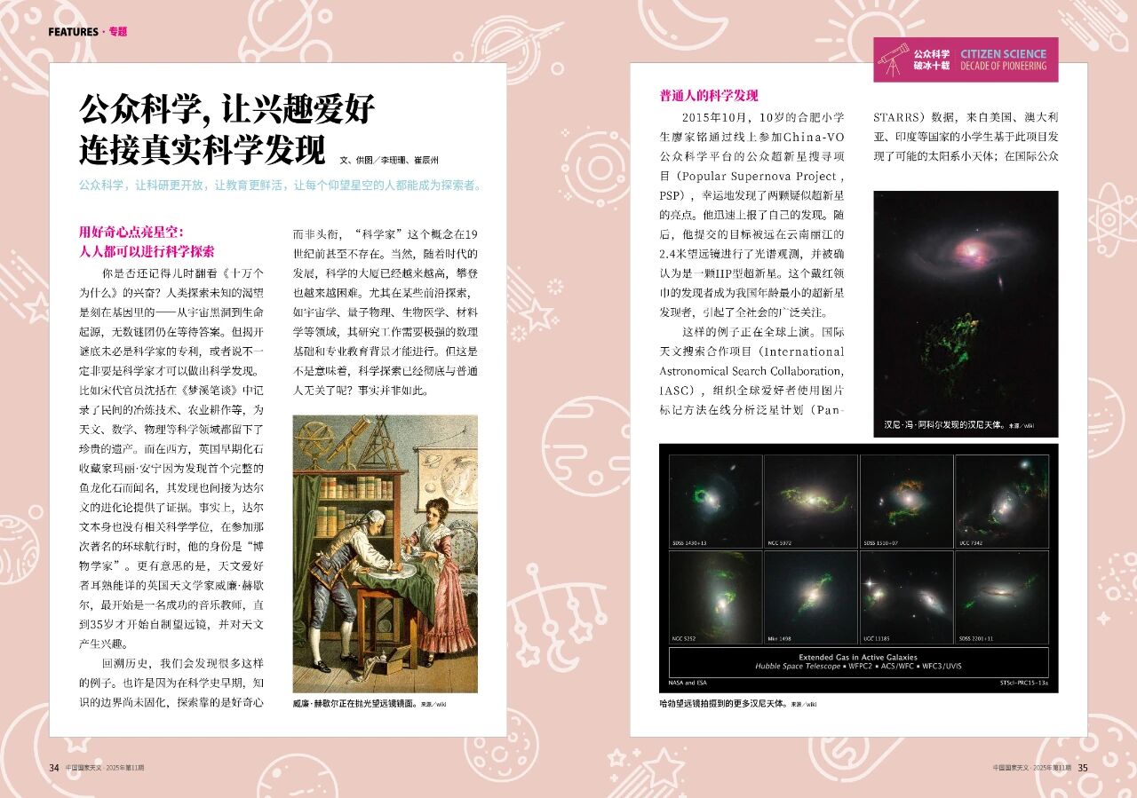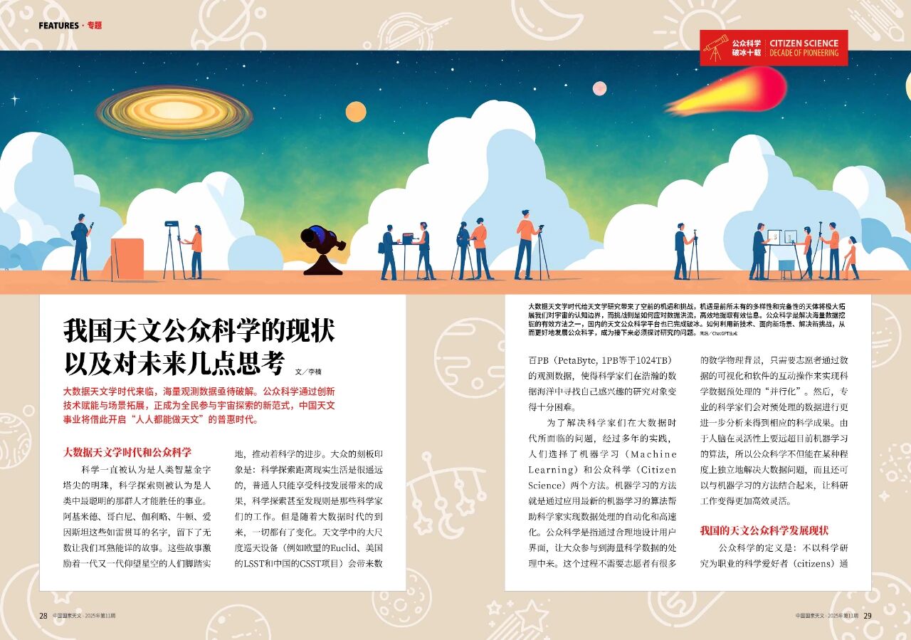 2015年可谓国内公众科学一个全新的起点。值此“破冰十年”之际,《中国国家天文》杂志与China-VO联合策划了本期“公众科学”专题,力图从不同维度展现公众科学的深度与广度:《天文公众科学之演变》回顾了人类公众科学的发展历程;《我国天文公众科学的现状以及对未来几点思考》阐释了天文领域公众科学的现状及思考;《公众科学,让兴趣爱好连接真实科学发现》系统梳理了从国际到国内的发展脉络,揭示了兴趣如何驱动科学贡献;《你我的星辰大海:中国公众科学之路与PSP项目的十年探索》以PSP项目为样本,生动展现了“一群人共同追梦”的社区力量;《星空下的奇景:红色精灵与名山大川的梦幻交织》展示了大气监测研究领域的合作范式;《从荒芜到繁盛:国内流星光学监测》讲述了流星这一浪漫现象的公众科学开展情况;《逐影寻星:从后院星空到前沿科学的探索之旅》则前瞻性地预言,在系外行星研究这个前沿领域,公众科学将通过“逐影寻星”等项目成为专业研究不可或缺的补充。