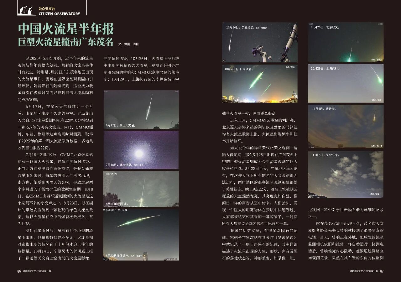 从2025年5月份开始,近半年来的流星观测与往年有很大差别。精彩的火流星事件时有发生。特别是5月28日广东茂名地区出现的火流星事件,更是在国际流星观测圈内引起热议。随着陨石陆续找到,这成为我国首次在极短时间内寻找到目击火流星陨石的成功案例。
