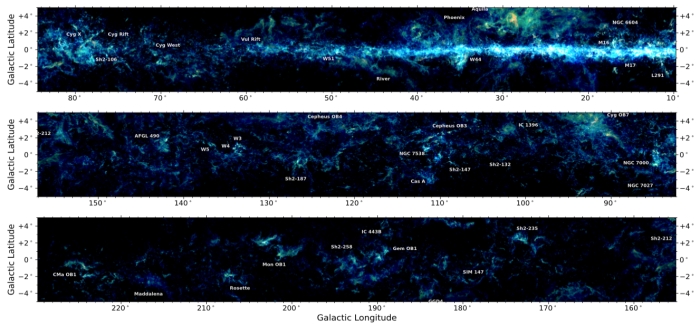 图中标识了著名的恒星形成区或气体结构。不同密度环境下的大尺度气体结构和形态各异的分子云细节清晰可见。