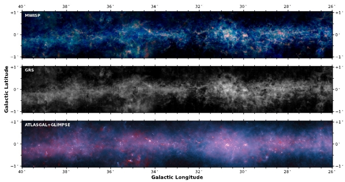 上图是银河画卷C¹⁸O、¹³CO和¹²CO(1—0)合成的RGB三色图,表征不同密度的分子气体环境;中图是GRS巡天的¹³CO(1—0)积分强度图;下图展示了ATLASGAL(870微米,红色)和Spitzer GLIMPSE(24微米,蓝色)的合成图,主要展示银盘上尘埃的热辐射。