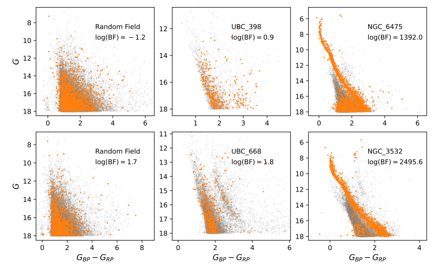 研究团队利用600个随机场星样本和1232个已确认的疏散星团进行了大规模测试。结果显示,贝叶斯因子能够极好地分离真实星团与虚假信号。研究发现,log10(BF) > 2(即贝叶斯因子大于100)是一个稳健的物理判据,意味着“星团+场星”模型的可能性至少是“纯场星”模型的100倍。这一阈值能够有效剔除绝大多数随机场星的统计涨落,同时保留真实的星团信号。