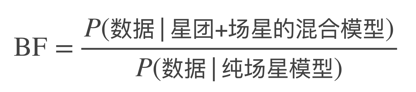针对这一难题,研究团队利用 MiMO 模型的贝叶斯框架,将“星团候选体验证”转化为一个严格的统计模型比较问题:即比较观测数据是更支持“单星族(星团)+场星”的混合模型,还是更支持“纯场星”模型。这两个模型证据的比值,即贝叶斯因子(Bayes Factor, BF),直接量化了星团存在的统计学支持强度。