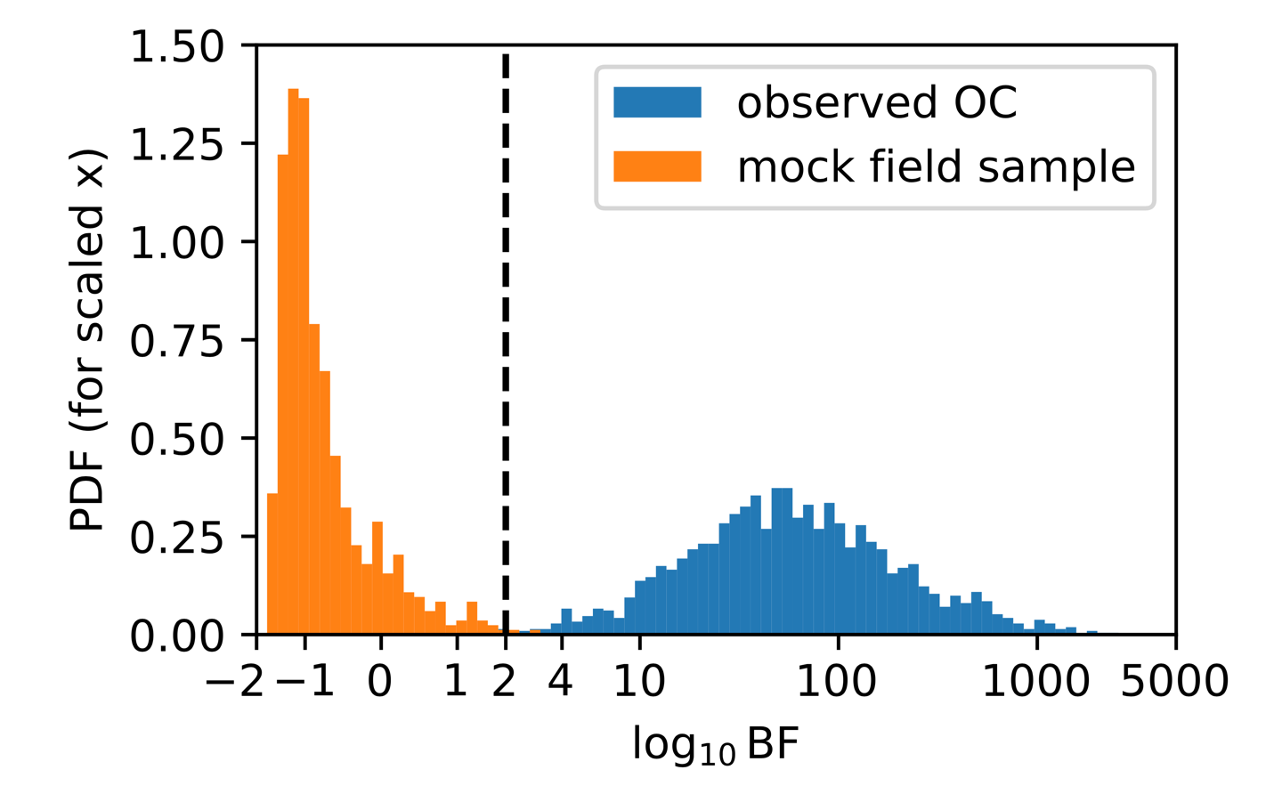 图3:贝叶斯因子对真实星团与虚假信号的显著区分能力。蓝色直方图代表已确认的真实疏散星团,橙色代表模拟的随机场星样本。虚线标示了了log_10(BF) = 2 的判定阈值。结果显示,该物理判据能有效将真实的物理系统与随机的背景涨落分离开来。