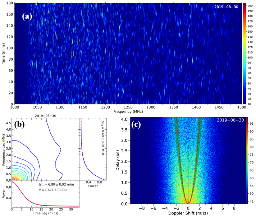 图:毫秒脉冲星B1937+21在1250兆赫兹频率下的动态谱(a)、自相关函数(b)和二级谱(c)。