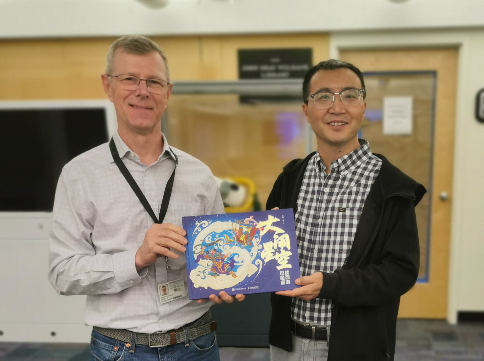 图10 国家天文台崔辰州博士将《大闹星空》图书和星图赠送给哈佛史密松天体物理中心ADS系统负责人Alberto Accomazzi博士收藏