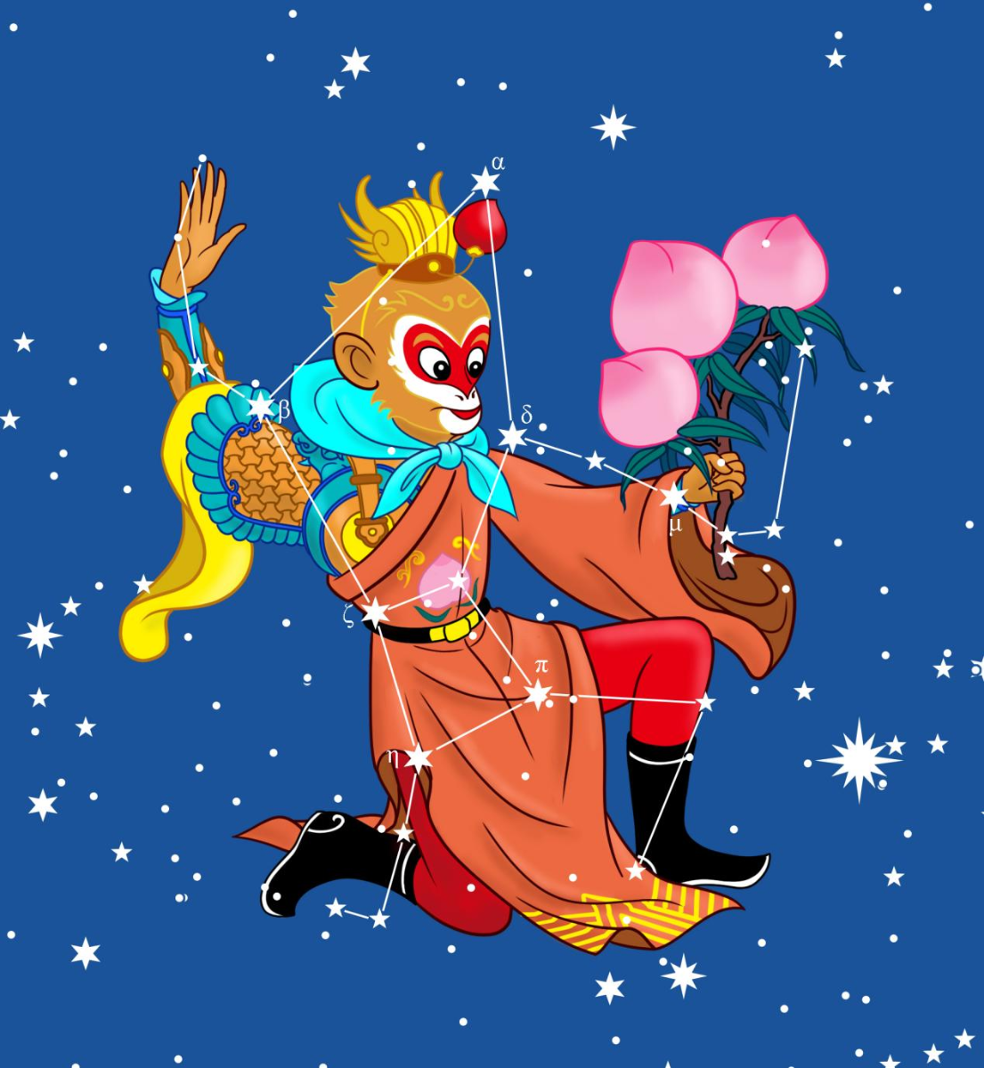 西游记星座图像的诞生多年来,笔者一直利用业余时间从事中西星座图像和星图的创作,绘制一套具有中国文化特色的星座图像,始终是我努力的方向之一。但在各国文化交流日益广泛的国际化视野下,简单地给星座人物穿上汉服,反而会显得不伦不类,既失去了希腊神话的叙事主线,又显得缺乏逻辑、杂乱无章。问题的核心在于:如何在不破坏科学性的前提下,为星座注入中国文化的灵魂?答案就是 “主题化”—— 不是简单的图像替换,而是寻找一个文化母体,对星座图像进行整体性、系统性的重塑。2018 年夏天,这个母体在我脑海中闪现 ——《西游记》!羊力大仙、牛魔王、金角银角、女儿国国王、蝎子精、奔波儿灞和灞波儿奔、黑熊精、金翅大鹏,不就是白羊、金牛、双子、室女、天蝎、双鱼、大熊和天鹰吗?托勒密 48 星座以及增补的航海十二星座、赫维留星座等,大都能相对容易地找到对应的西游记人物。难点是拉卡伊以科学仪器和艺术工具命名的星座,虽无法直接对应,但大部分也能通过功能相似、内涵相近等特点,找到相对满意的替代物。最终,88 个星座中仅有罗盘、望远镜、圆规和绘架四个星座没能匹配合适的形象,但这四个次要星座对整个西游记星座体系几乎没有影响。2021 年初,星座图像和星图的绘制基本完成;2025 年,正式出版了基于西游记星座图像的科普读物《大闹星空:读西游 识星座》和两幅星图《大闹星空:西游星座图》。