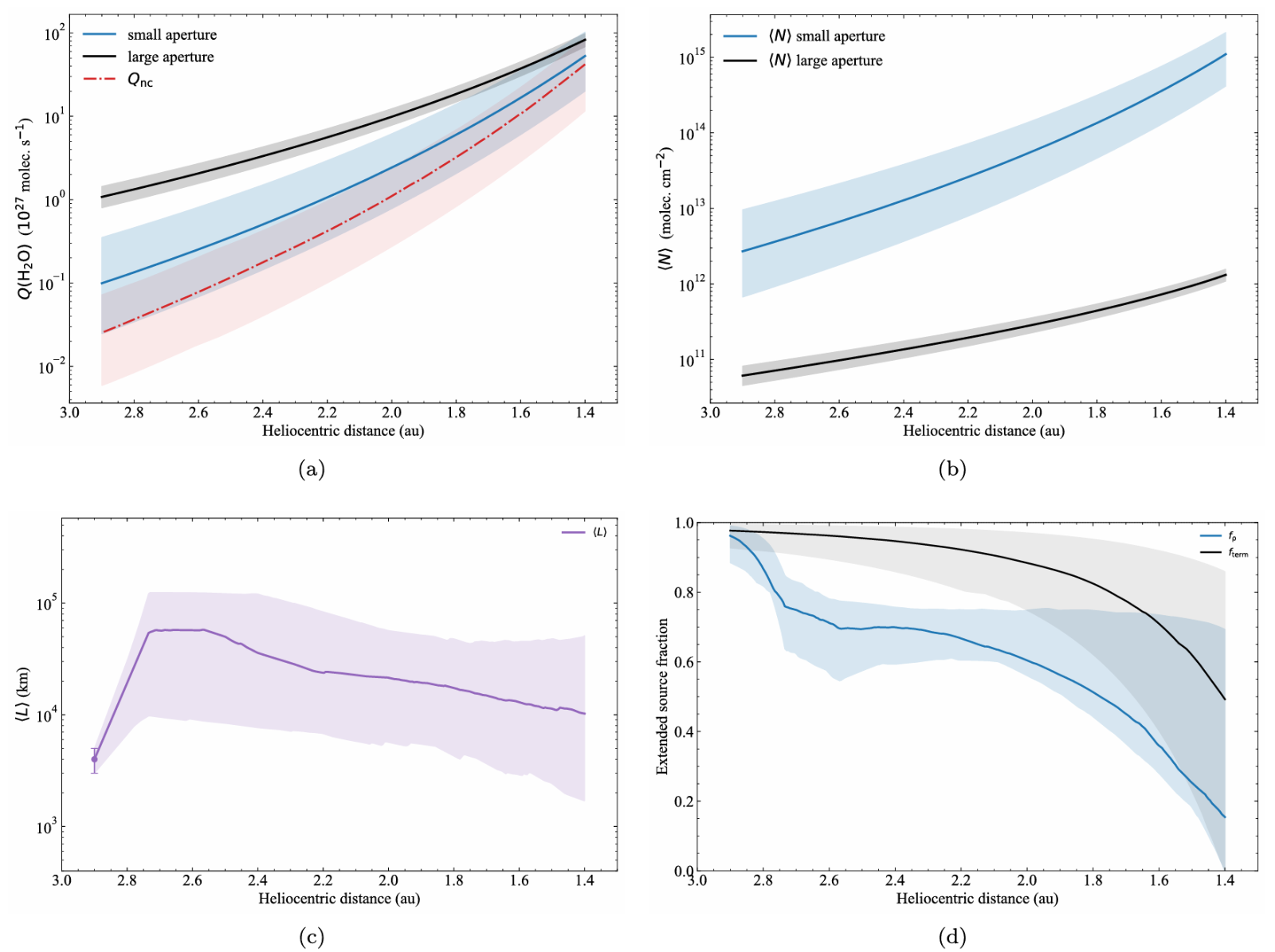 图1. 3I/ATLAS中扩展源的贡献模拟。(a) H2O产生率与日心距的幂律关系(黑:大孔径数据;蓝:小孔径数据;红:直接来自于彗核的产生率)。(b) 柱密度随日心距的变化关系。(c) H2O扩展源的等效空间尺度随日心距的变化关系。(d) 不同口径测得的水产生率中,扩展源所占的比例随日心距的变化关系。