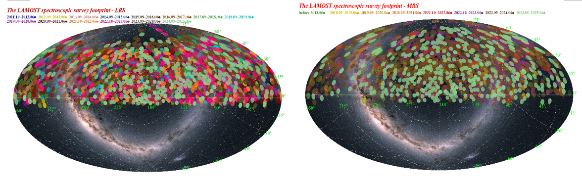 图2 左图为LAMOST DR13的低分辨率天区覆盖图,右图为DR13的中分辨率天区覆盖图