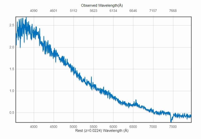 3月19日8时许,意大利国家天体物理研究所帕多瓦天文台Andrea Reguitti博士等人使用西玛·埃卡(Cima Ekar)观测站的1.82米哥白尼望远镜(Copernico Telescope)对该候选体进行了光谱观测,并于不久后将光谱数据和分类结果上传至TNS,确认这是一颗II型超新星,红移0.0224,该候选体的编号变更为超新星编号SN 2026fsf。他们在附注中写道:“蓝色连续谱中隐约可见一条宽阔的Hα线(半峰全宽约15000公里/秒),这与早期核坍缩型超新星的光谱特征一致。狭窄的Hα线的红移值与宿主星系的红移值相符。”