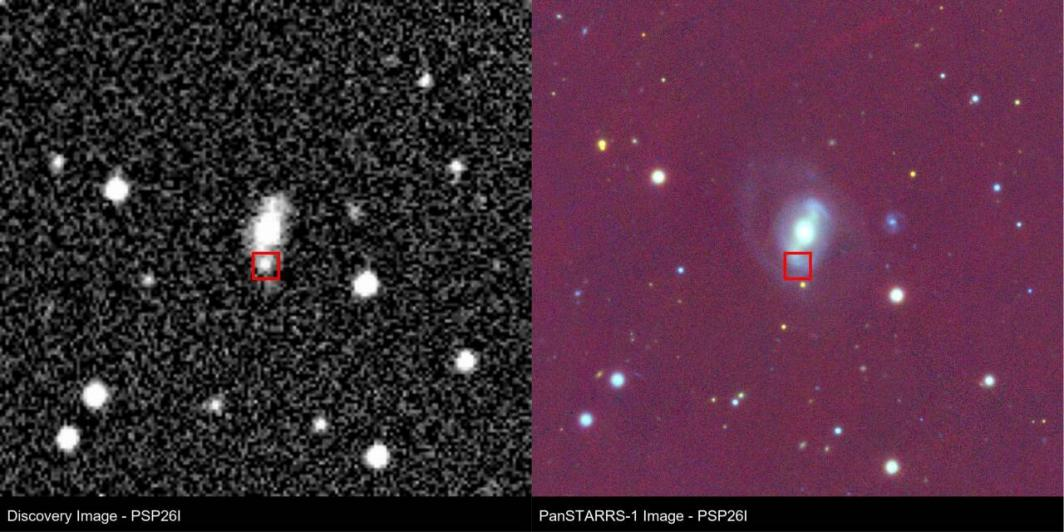 图1 PSP 发现图像(左)中心方框处可见 NGC 3961 星系附近的新星点,而 Pan-STARRS 历史图像(右)对应位置没有天体。