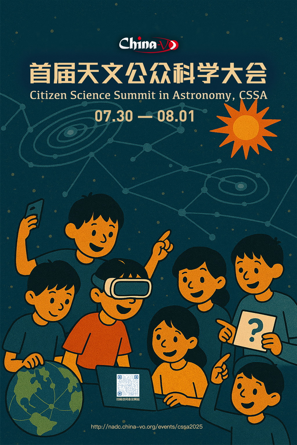 天文公众科学大会(CSSA),搭建一个开放、包容的交流平台,倡导全民科学理念,推动天文学的普及与公众参与。聚焦公众科学项目的实践与创新,展示公众科学项目成果,培育新的公众科学项目,推动天文数据的开放共享和人工智能的科学应用,鼓励公众积极参与天文观测、数据分析和科学探索,激发全社会对宇宙探索的兴趣与热情。