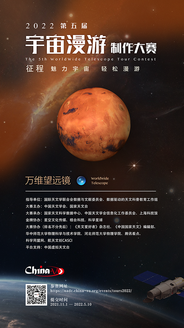 为响应全民科学素质行动计划纲要号召,倡导数据驱动的科普教育理念,推进科技资源开放共享,传播科学知识,现由中国天文学会、中国科学院国家天文台联合发起第五届宇宙漫游创作大赛,并于2021年10月正式启动。本大赛旨在通过万维望远镜宇宙漫游的设计、制作,激发参赛者的科学兴趣,提高科技创新和实践能力,培养团队合作精神。